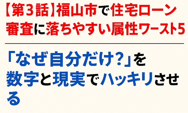 住宅ローン審査には、福山市近郊ならではの“落ちやすいパターン”が存在します。 この記事では、現場の事例から見えてきた 【落ちやすい属性ワースト5】を整理し、 それぞれにどんな対策が必要なのかをお伝えします。