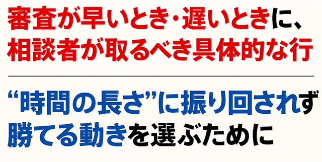 ここを理解せずに、「早かった/遅かった」という表面だけを見て一喜一憂してしまうと、 本来通せたはずの審査を自分で難しくしてしまうこともあります。